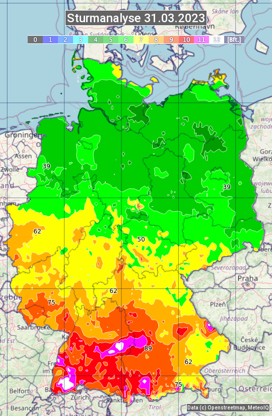 Die Sturmanalyse vom 31.03.2023 zeigt die maximalen Windböen des Tages. Die Angabe erfolgt als Windstärke in Beaufort.