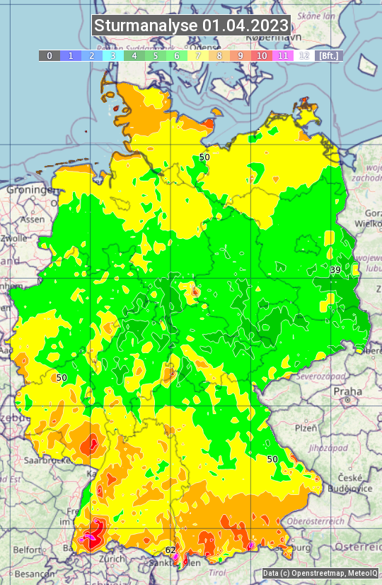 Die Sturmanalyse vom 01.04.2023 zeigt die maximalen Windböen des Tages. Die Angabe erfolgt als Windstärke in Beaufort.
