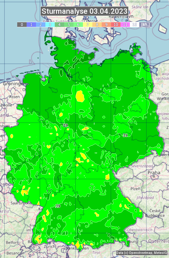 Die Sturmanalyse vom 03.04.2023 zeigt die maximalen Windböen des Tages. Die Angabe erfolgt als Windstärke in Beaufort.