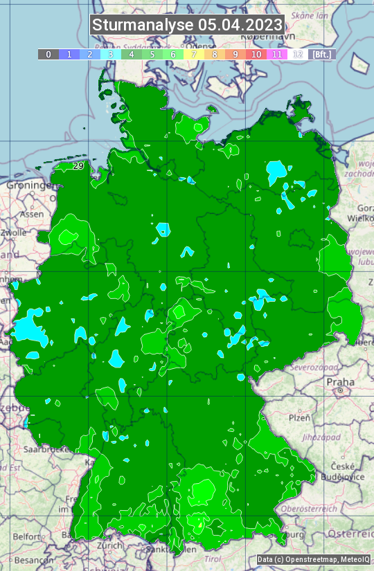 Die Sturmanalyse vom 05.04.2023 zeigt die maximalen Windböen des Tages. Die Angabe erfolgt als Windstärke in Beaufort.