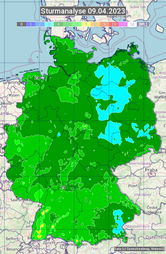 Die Sturmanalyse vom 09.04.2023 zeigt die maximalen Windböen des Tages. Die Angabe erfolgt als Windstärke in Beaufort.