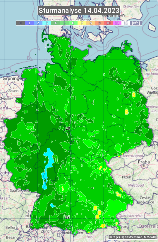Die Sturmanalyse vom 14.04.2023 zeigt die maximalen Windböen des Tages. Die Angabe erfolgt als Windstärke in Beaufort.