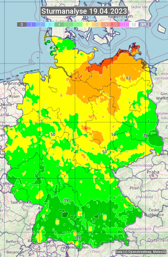 Die Sturmanalyse vom 19.04.2023 zeigt die maximalen Windböen des Tages. Die Angabe erfolgt als Windstärke in Beaufort.