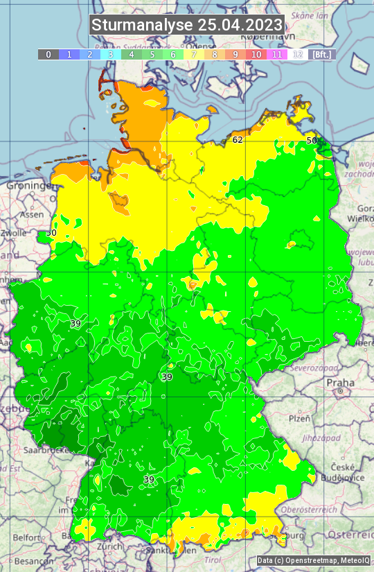 Die Sturmanalyse vom 25.04.2023 zeigt die maximalen Windböen des Tages. Die Angabe erfolgt als Windstärke in Beaufort.