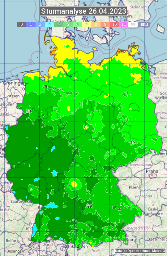Die Sturmanalyse vom 26.04.2023 zeigt die maximalen Windböen des Tages. Die Angabe erfolgt als Windstärke in Beaufort.