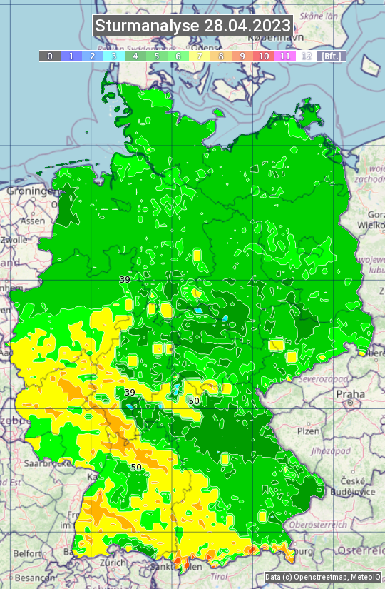 Die Sturmanalyse vom 28.04.2023 zeigt die maximalen Windböen des Tages. Die Angabe erfolgt als Windstärke in Beaufort.