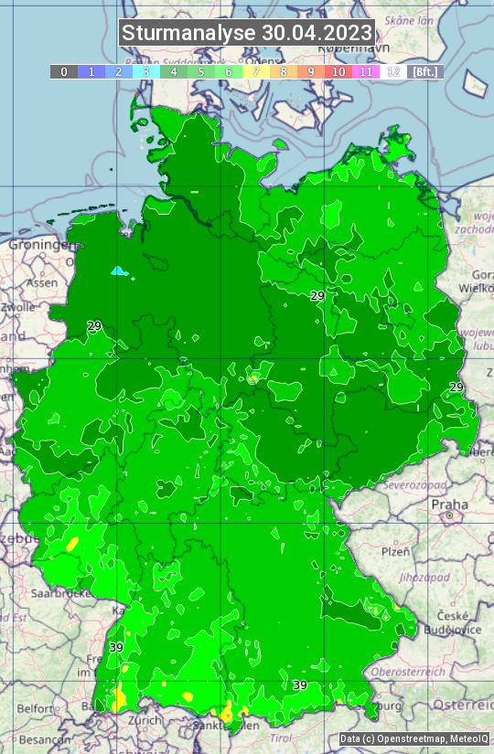 Die Sturmanalyse vom 30.04.2023 zeigt die maximalen Windböen des Tages. Die Angabe erfolgt als Windstärke in Beaufort.
