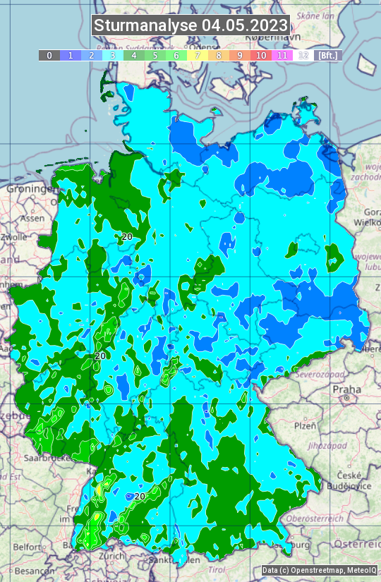 Die Sturmanalyse vom 04.05.2023 zeigt die maximalen Windböen des Tages. Die Angabe erfolgt als Windstärke in Beaufort.