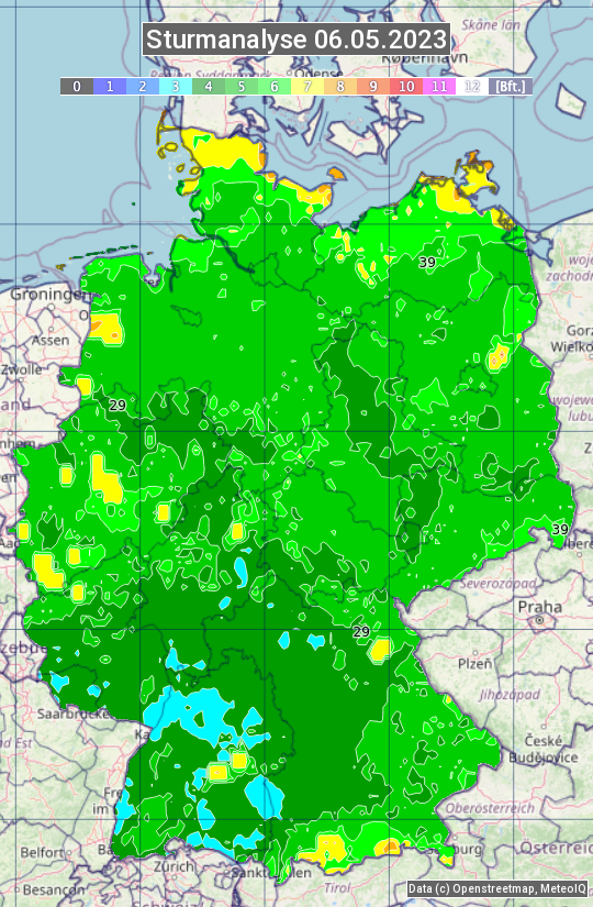 Die Sturmanalyse vom 06.05.2023 zeigt die maximalen Windböen des Tages. Die Angabe erfolgt als Windstärke in Beaufort.