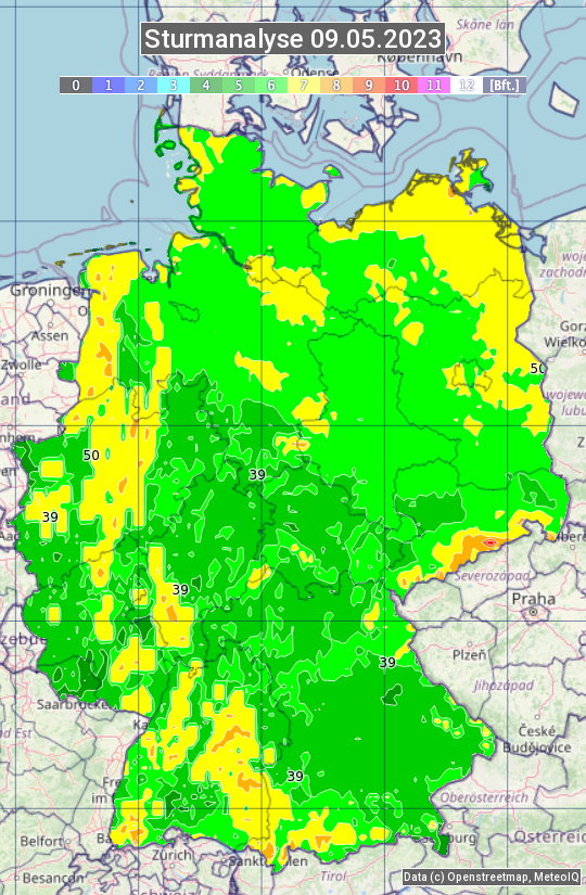 Die Sturmanalyse vom 09.05.2023 zeigt die maximalen Windböen des Tages. Die Angabe erfolgt als Windstärke in Beaufort.