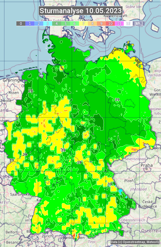 Die Sturmanalyse vom 10.05.2023 zeigt die maximalen Windböen des Tages. Die Angabe erfolgt als Windstärke in Beaufort.