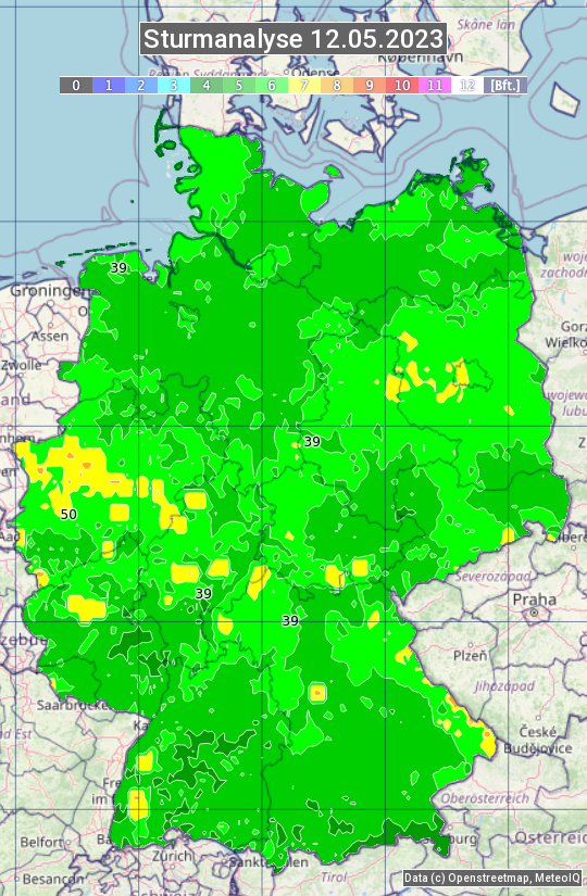 Die Sturmanalyse vom 12.05.2023 zeigt die maximalen Windböen des Tages. Die Angabe erfolgt als Windstärke in Beaufort.