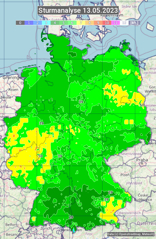 Die Sturmanalyse vom 13.05.2023 zeigt die maximalen Windböen des Tages. Die Angabe erfolgt als Windstärke in Beaufort.