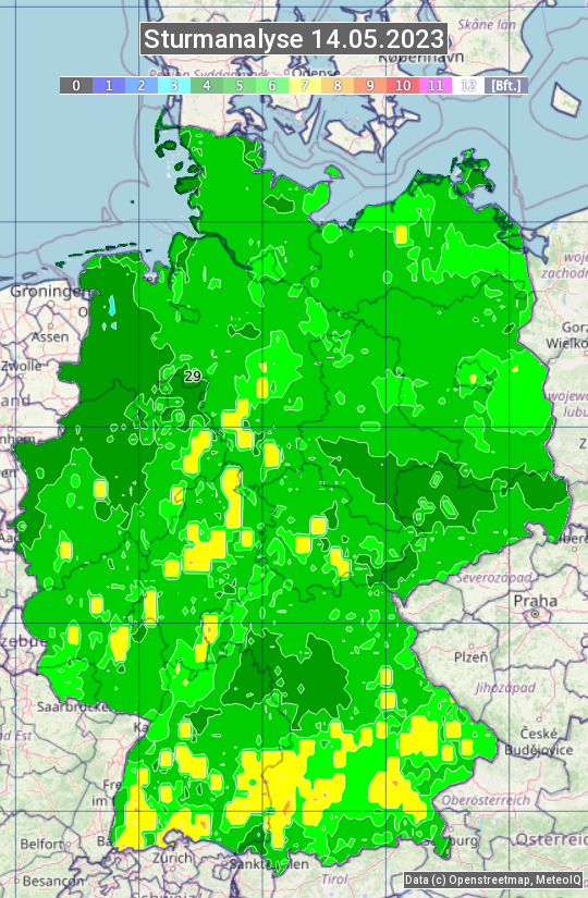 Die Sturmanalyse vom 14.05.2023 zeigt die maximalen Windböen des Tages. Die Angabe erfolgt als Windstärke in Beaufort.