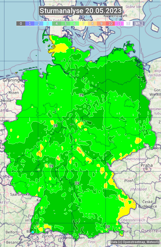 Die Sturmanalyse vom 20.05.2023 zeigt die maximalen Windböen des Tages. Die Angabe erfolgt als Windstärke in Beaufort.