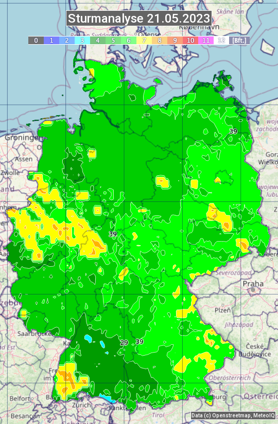 Die Sturmanalyse vom 21.05.2023 zeigt die maximalen Windböen des Tages. Die Angabe erfolgt als Windstärke in Beaufort.