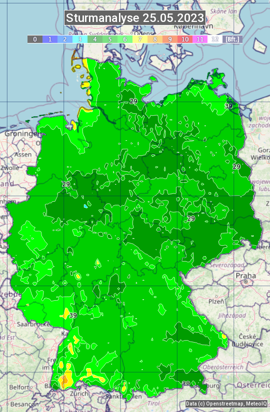 Die Sturmanalyse vom 25.05.2023 zeigt die maximalen Windböen des Tages. Die Angabe erfolgt als Windstärke in Beaufort.