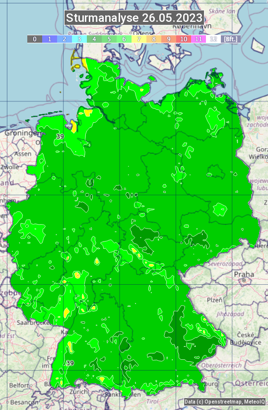 Die Sturmanalyse vom 26.05.2023 zeigt die maximalen Windböen des Tages. Die Angabe erfolgt als Windstärke in Beaufort.