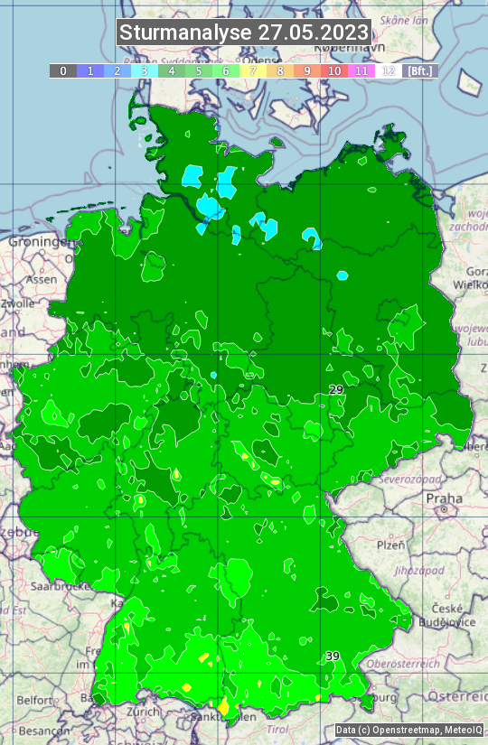 Die Sturmanalyse vom 27.05.2023 zeigt die maximalen Windböen des Tages. Die Angabe erfolgt als Windstärke in Beaufort.