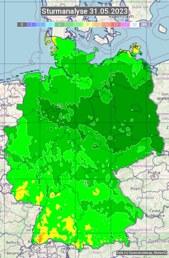 Die Sturmanalyse vom 31.05.2023 zeigt die maximalen Windböen des Tages. Die Angabe erfolgt als Windstärke in Beaufort.