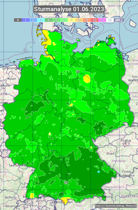 Die Sturmanalyse vom 01.06.2023 zeigt die maximalen Windböen des Tages. Die Angabe erfolgt als Windstärke in Beaufort.