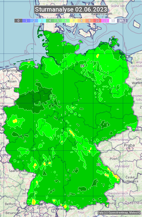 Die Sturmanalyse vom 02.06.2023 zeigt die maximalen Windböen des Tages. Die Angabe erfolgt als Windstärke in Beaufort.