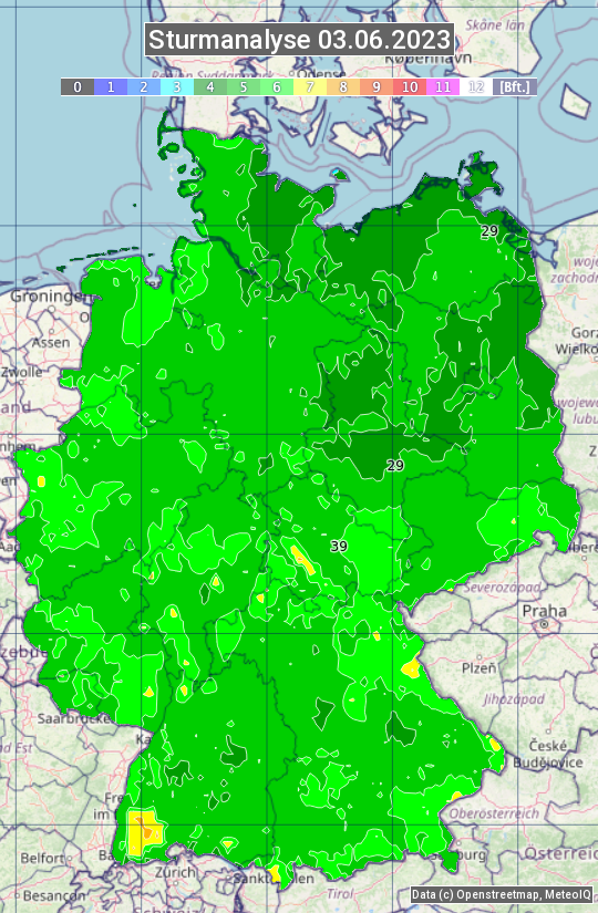 Die Sturmanalyse vom 03.06.2023 zeigt die maximalen Windböen des Tages. Die Angabe erfolgt als Windstärke in Beaufort.
