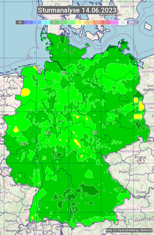 Die Sturmanalyse vom 14.06.2023 zeigt die maximalen Windböen des Tages. Die Angabe erfolgt als Windstärke in Beaufort.