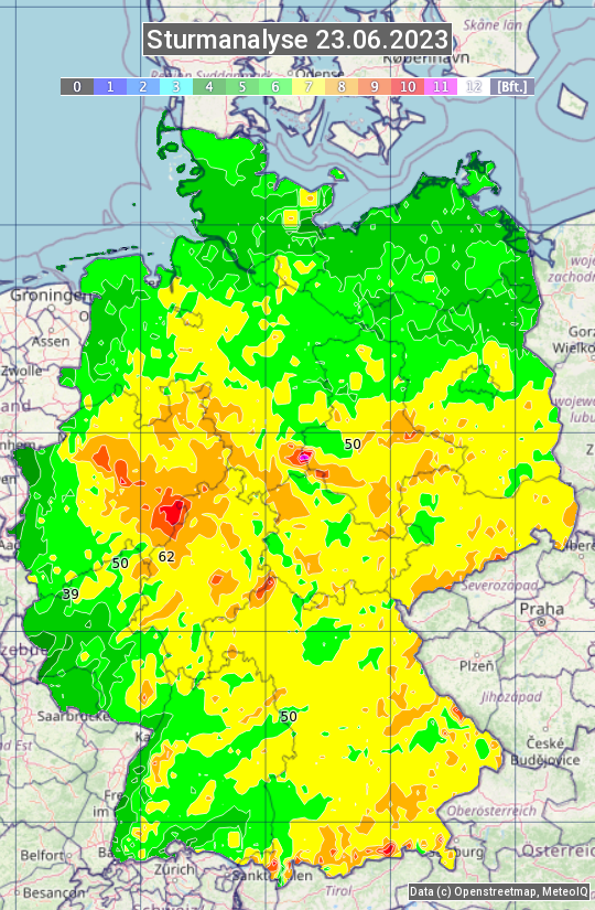 Die Sturmanalyse vom 23.06.2023 zeigt die maximalen Windböen des Tages. Die Angabe erfolgt als Windstärke in Beaufort.