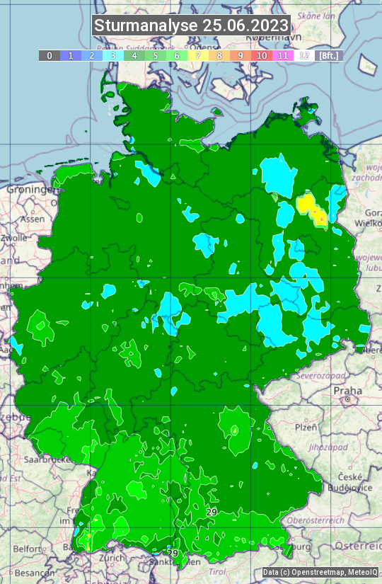 Die Sturmanalyse vom 25.06.2023 zeigt die maximalen Windböen des Tages. Die Angabe erfolgt als Windstärke in Beaufort.