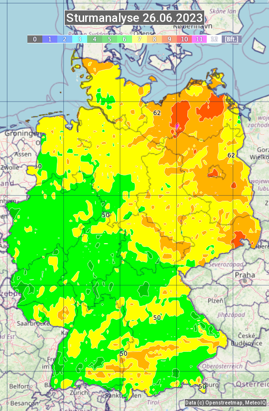 Die Sturmanalyse vom 26.06.2023 zeigt die maximalen Windböen des Tages. Die Angabe erfolgt als Windstärke in Beaufort.