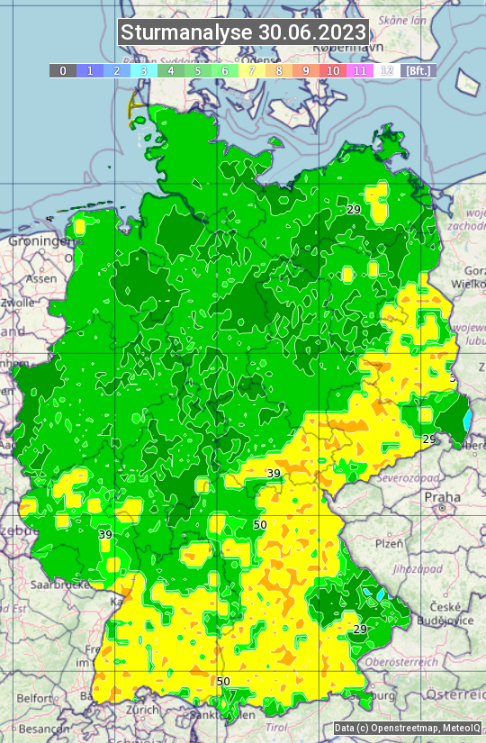 Die Sturmanalyse vom 30.06.2023 zeigt die maximalen Windböen des Tages. Die Angabe erfolgt als Windstärke in Beaufort.