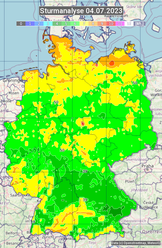 Die Sturmanalyse vom 04.07.2023 zeigt die maximalen Windböen des Tages. Die Angabe erfolgt als Windstärke in Beaufort.