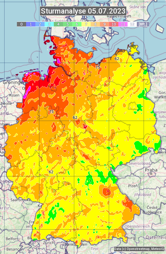 Die Sturmanalyse vom 05.07.2023 zeigt die maximalen Windböen des Tages. Die Angabe erfolgt als Windstärke in Beaufort.
