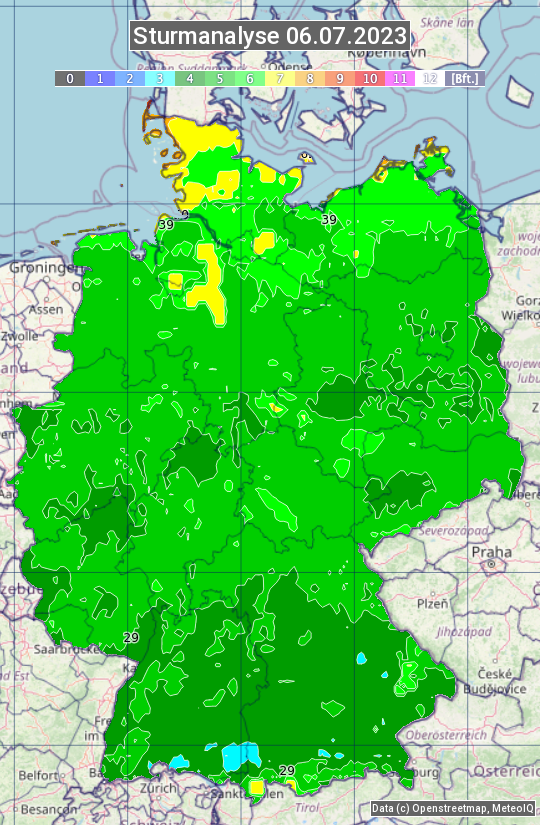 Die Sturmanalyse vom 06.07.2023 zeigt die maximalen Windböen des Tages. Die Angabe erfolgt als Windstärke in Beaufort.