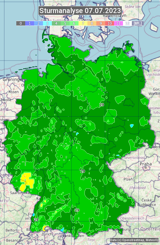 Die Sturmanalyse vom 07.07.2023 zeigt die maximalen Windböen des Tages. Die Angabe erfolgt als Windstärke in Beaufort.