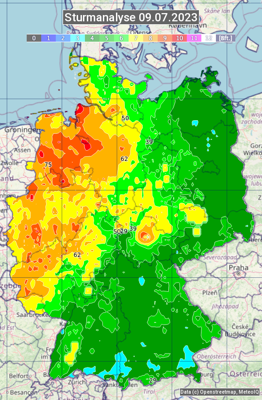 Die Sturmanalyse vom 09.07.2023 zeigt die maximalen Windböen des Tages. Die Angabe erfolgt als Windstärke in Beaufort.