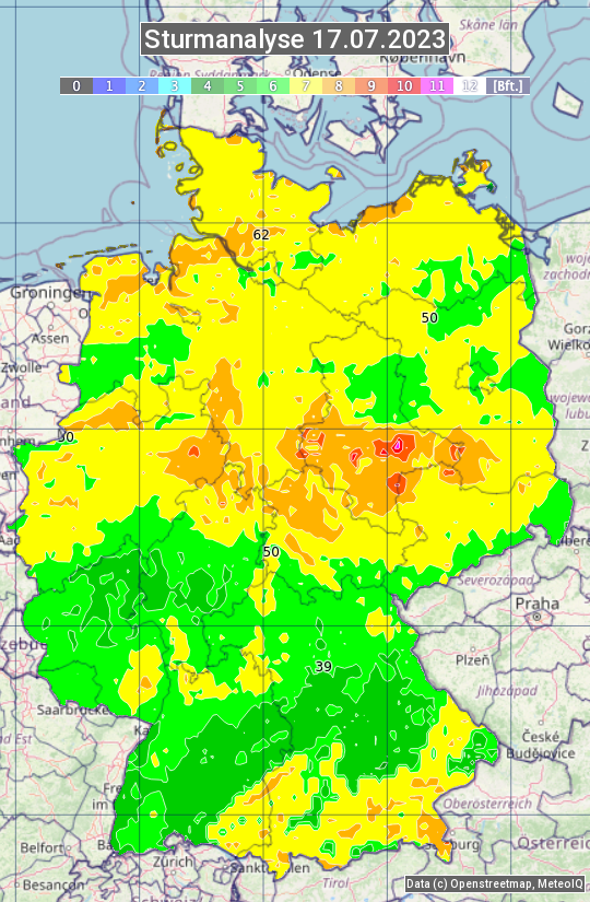 Die Sturmanalyse vom 17.07.2023 zeigt die maximalen Windböen des Tages. Die Angabe erfolgt als Windstärke in Beaufort.