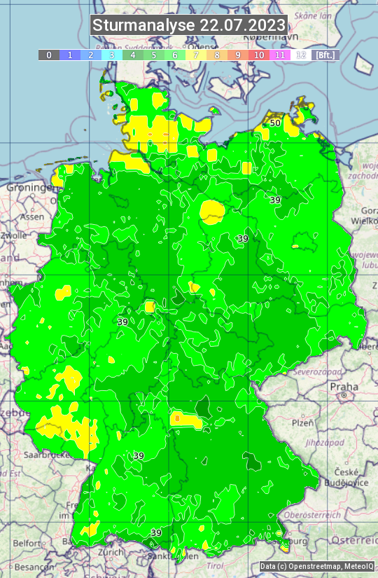 Die Sturmanalyse vom 22.07.2023 zeigt die maximalen Windböen des Tages. Die Angabe erfolgt als Windstärke in Beaufort.
