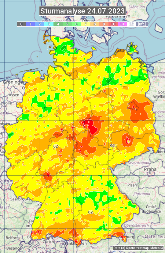 Die Sturmanalyse vom 24.07.2023 zeigt die maximalen Windböen des Tages. Die Angabe erfolgt als Windstärke in Beaufort.