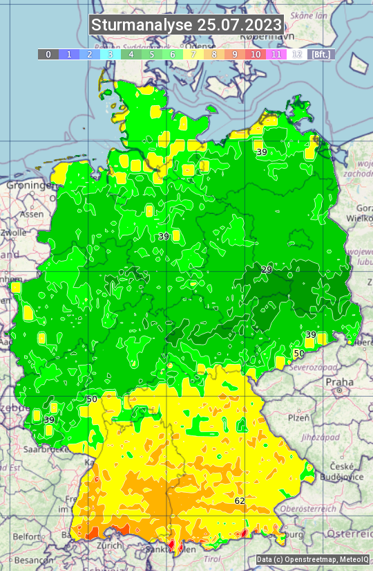Die Sturmanalyse vom 25.07.2023 zeigt die maximalen Windböen des Tages. Die Angabe erfolgt als Windstärke in Beaufort.