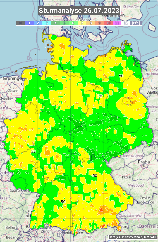 Die Sturmanalyse vom 26.07.2023 zeigt die maximalen Windböen des Tages. Die Angabe erfolgt als Windstärke in Beaufort.