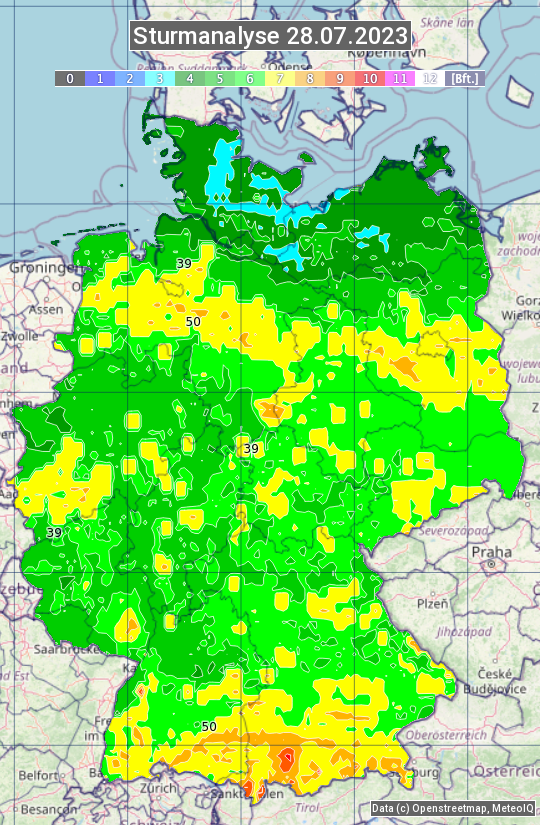Die Sturmanalyse vom 28.07.2023 zeigt die maximalen Windböen des Tages. Die Angabe erfolgt als Windstärke in Beaufort.