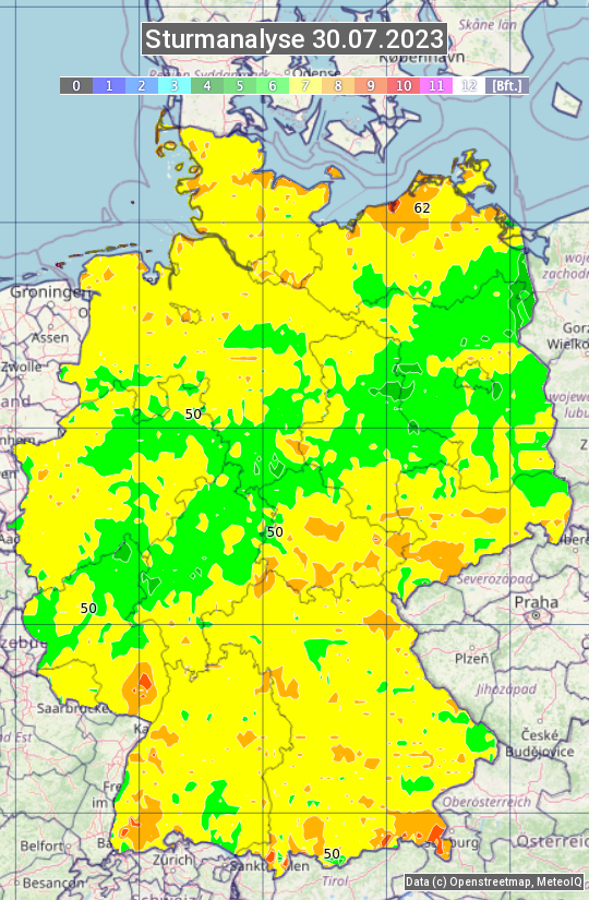 Die Sturmanalyse vom 30.07.2023 zeigt die maximalen Windböen des Tages. Die Angabe erfolgt als Windstärke in Beaufort.