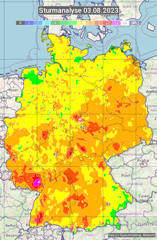 Die Sturmanalyse vom 03.08.2023 zeigt die maximalen Windböen des Tages. Die Angabe erfolgt als Windstärke in Beaufort.