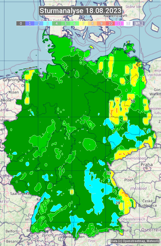 Die Sturmanalyse vom 18.08.2023 zeigt die maximalen Windböen des Tages. Die Angabe erfolgt als Windstärke in Beaufort.