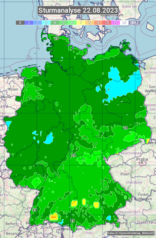 Die Sturmanalyse vom 22.08.2023 zeigt die maximalen Windböen des Tages. Die Angabe erfolgt als Windstärke in Beaufort.