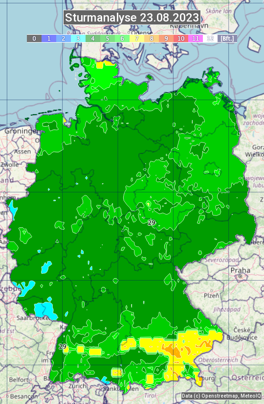 Die Sturmanalyse vom 23.08.2023 zeigt die maximalen Windböen des Tages. Die Angabe erfolgt als Windstärke in Beaufort.