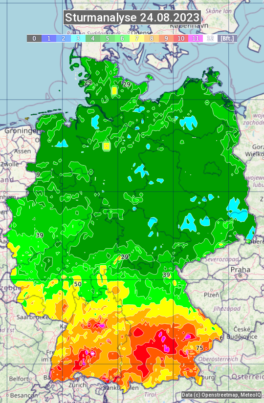 Die Sturmanalyse vom 24.08.2023 zeigt die maximalen Windböen des Tages. Die Angabe erfolgt als Windstärke in Beaufort.