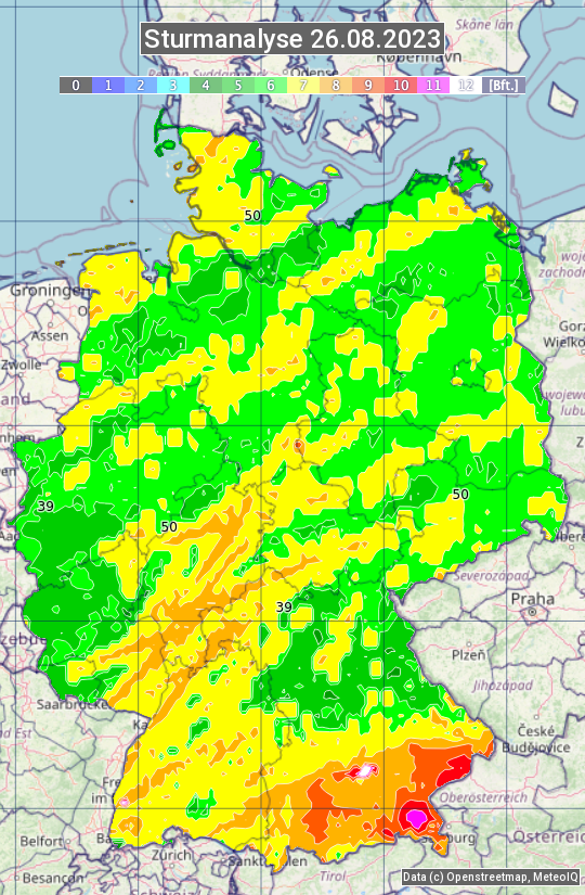 Die Sturmanalyse vom 26.08.2023 zeigt die maximalen Windböen des Tages. Die Angabe erfolgt als Windstärke in Beaufort.